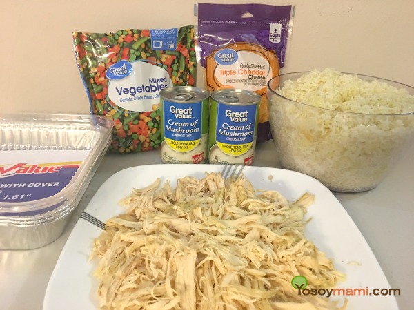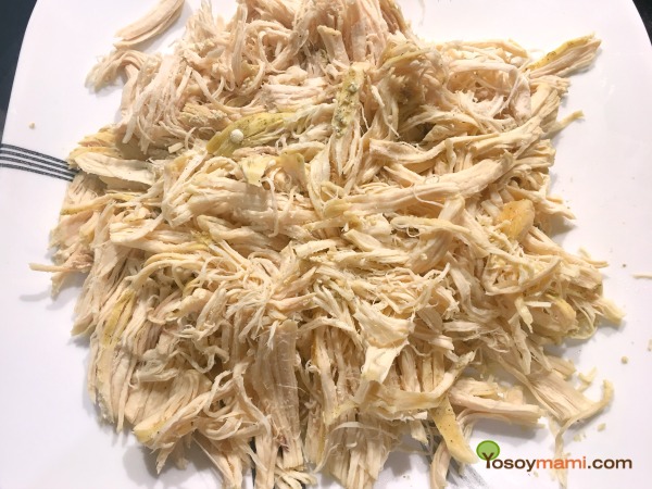 Todo empieza con el pollo y el arroz. Yo cociné dos pechugas de pollo en el slow cooker por 3 horas en high. Lo único que les eché fue adobo. Al final de las 3 horas, las saqué y las desmenuzé con dos tenedores. Otra alternativa es comprar de esos pollos “rotisserie” que venden en el supermercado o Costco y desmenuzarlos. Más fácil. 😉