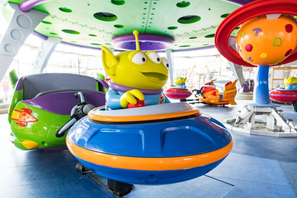 Diseñada como un set de juguete que Andy ganó en el restaurante Pizza Planet, esta atracción completamente nueva traerá diversión fuera de este mundo. Los platillos voladores de los alienígenas verdes de “Toy Story” están listos, y aquí, en la Tierra, los visitantes pueden sumarse al juego. En naves espaciales de juguete, los visitantes girarán y darán vueltas sin parar entre planetas de juguete y estaciones espaciales, mientras “La Garra” (The Claw) se balancea sobre ellos. Esta aventura espacial está cubierta de iluminación multicolor y efectos de sonido de galaxias lejanas.